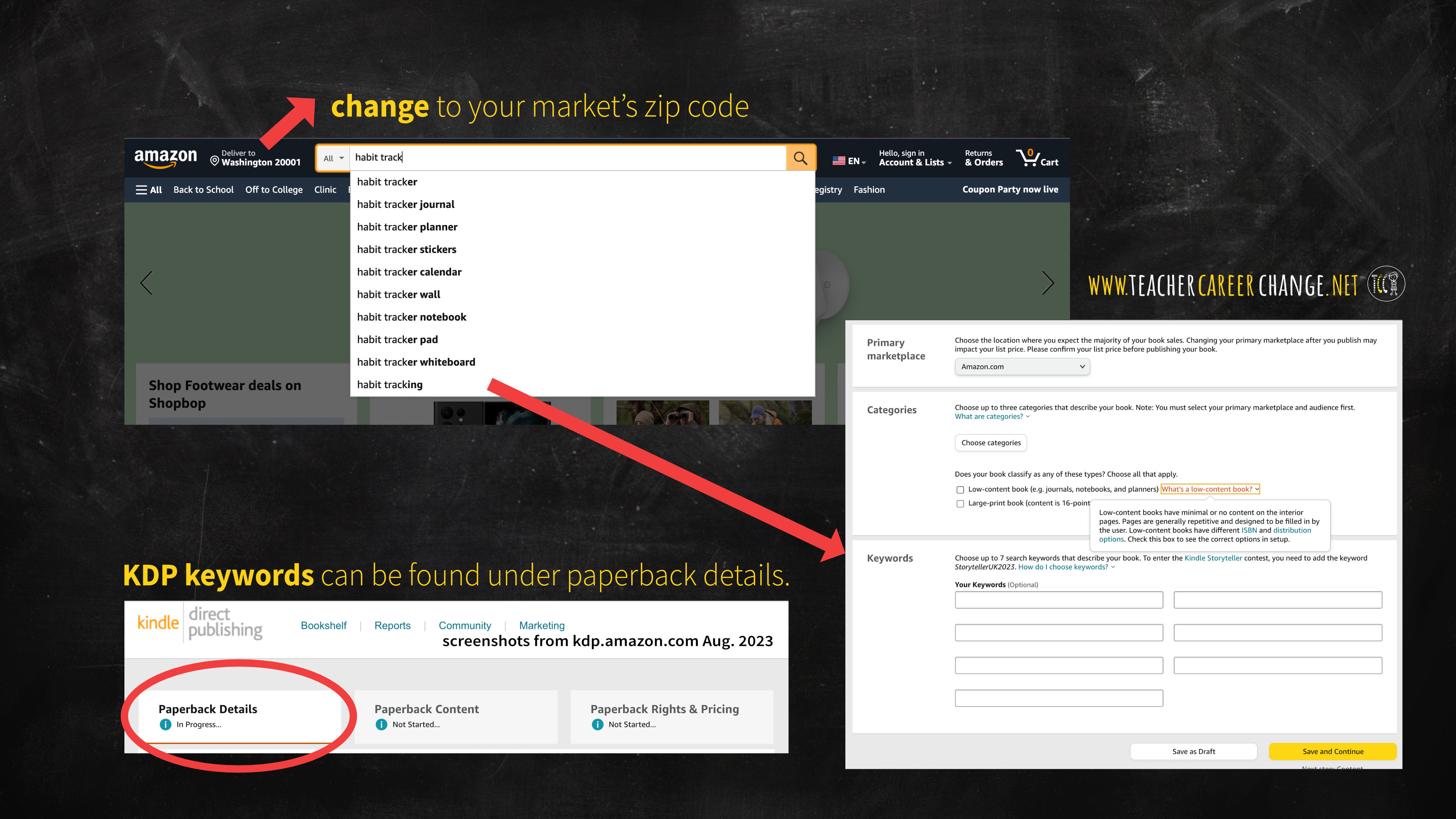 People go to Amazon to buy. Go to the main site at Amazon.com and start searching for a low-content book idea. Amazon will automatically will give you suggestions. Those are what buyers are searching. Copy those words and look at what is available to start brainstorming what low-content book you can create. If you are outside your target market, put the zip code of your intended buyers in the upper left where it says: “deliver to.” That will change your search results.
