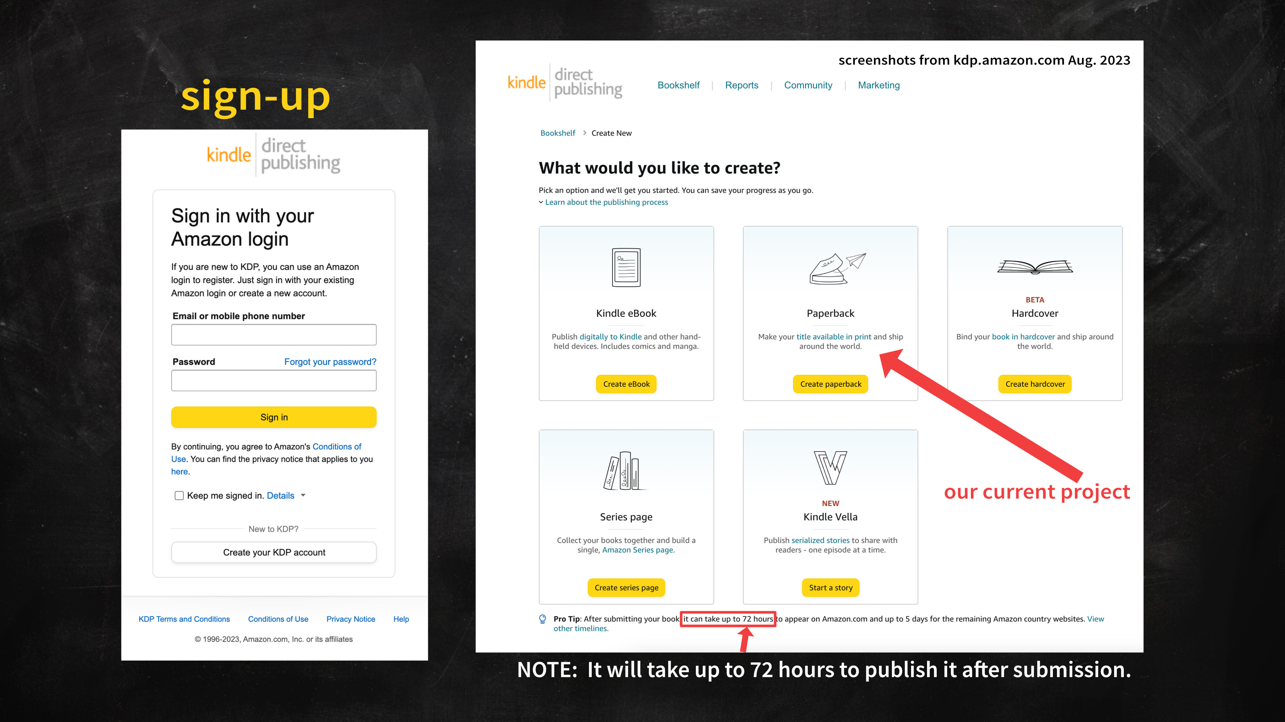 Once you sign-up for a KDP account, you will be asked what you want to create. Here are the options: