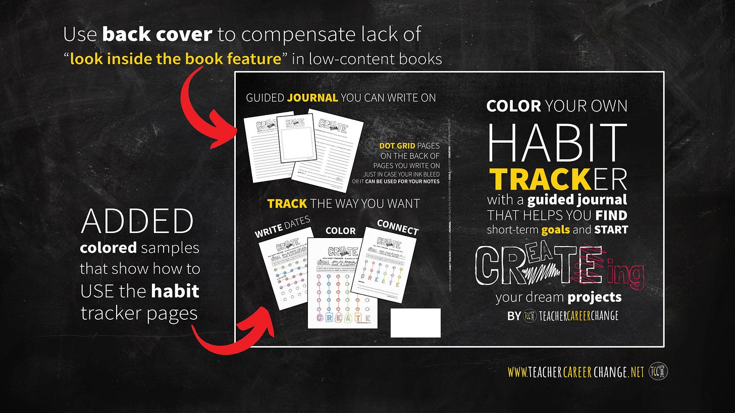 Amazon buyers usually click on the “Look Inside the Book” feature to see samples of inside pages. Unfortunately, some low-content books are not allowed this feature. One solution is to use the back cover to show samples of the inside pages.