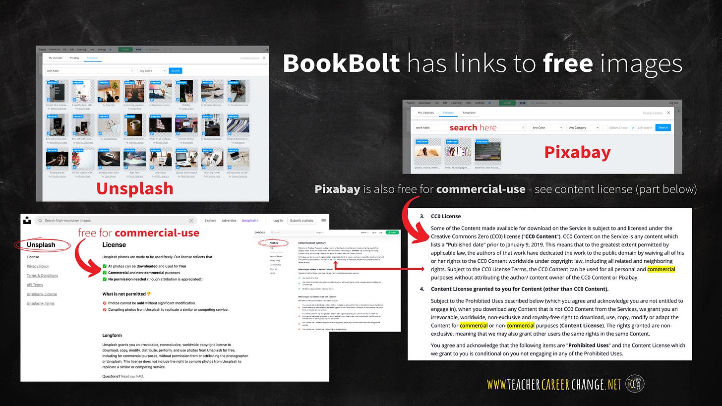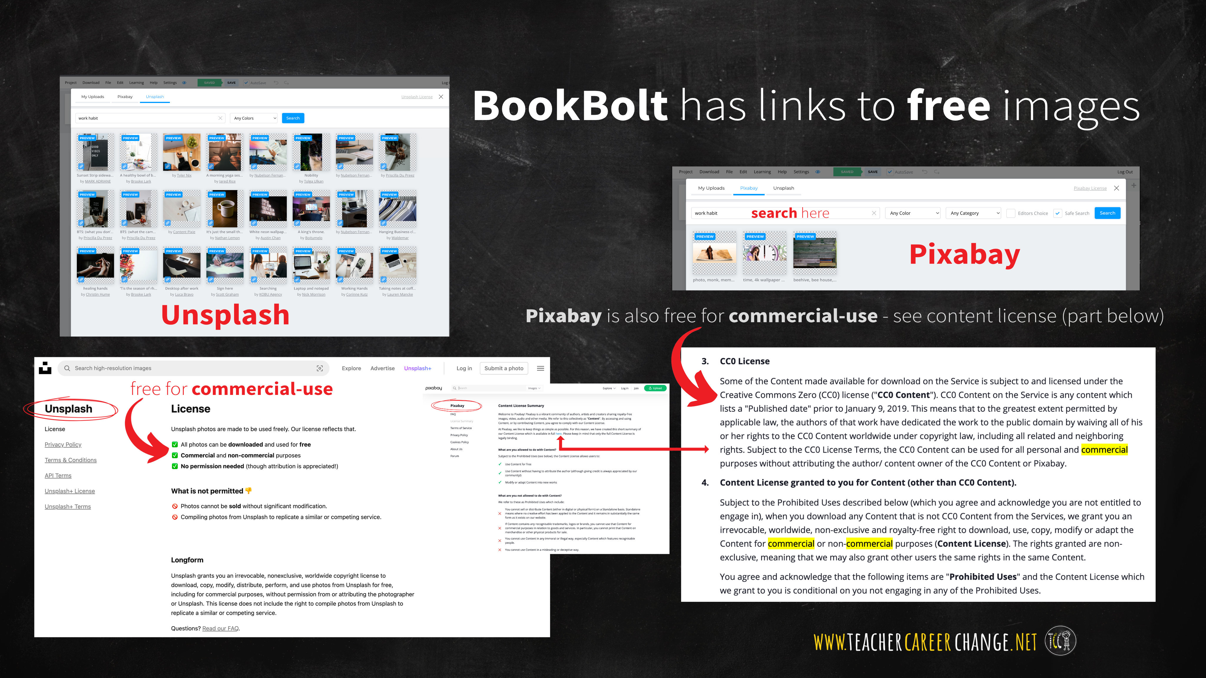 Remember BookBolt from our last two posts? Well, within its design panel, it has links to free commercial use image websites. You can see their license terms at: