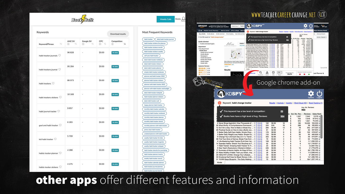 I also have BookBolt and a Google Chrome extension called KDP Spy Pro. The maker of BookBolt started with an app called Merch Informer for Print-on-Demand shirts and more. When KDP became available for low-content books, he made BookBolt. It’s a comprehensive app that helps low-content book creators from keyword search to book design. KDP Spy Pro, on the other hand, is more about keywords that your competitors are using and how much they are supposedly earning.