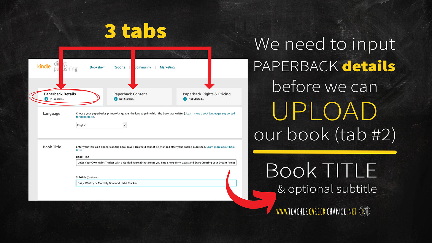 When you create a paperback from your Kindle account, you will see three tabs. We cannot upload our book until we finish answering questions on the first tab: paperback details.