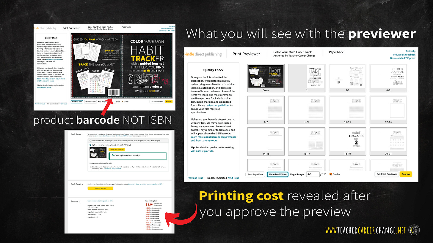 Launch the previewer and to check how your book cover and inside pages look. After you click on “approve” the printing cost will be revealed at the lower end of the 2nd tab form. Use this to decide your pricing strategy for the 3rd tab. Once you put your prices (printing cost + desired royalty per book) you can submit your book for approval. We will wrap up this series in the next post then start a new series. Subscribe for free so you’ll not miss a post.